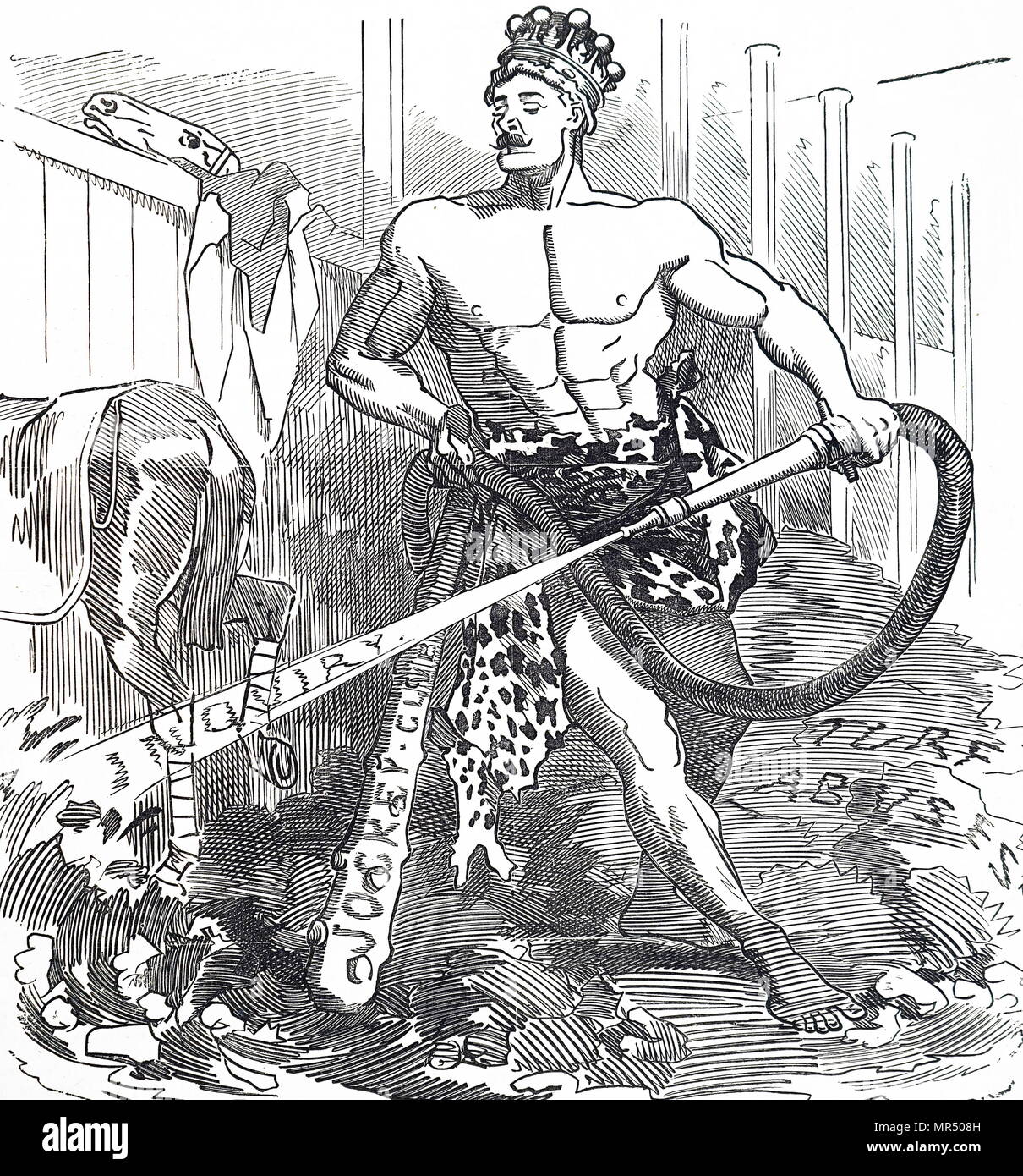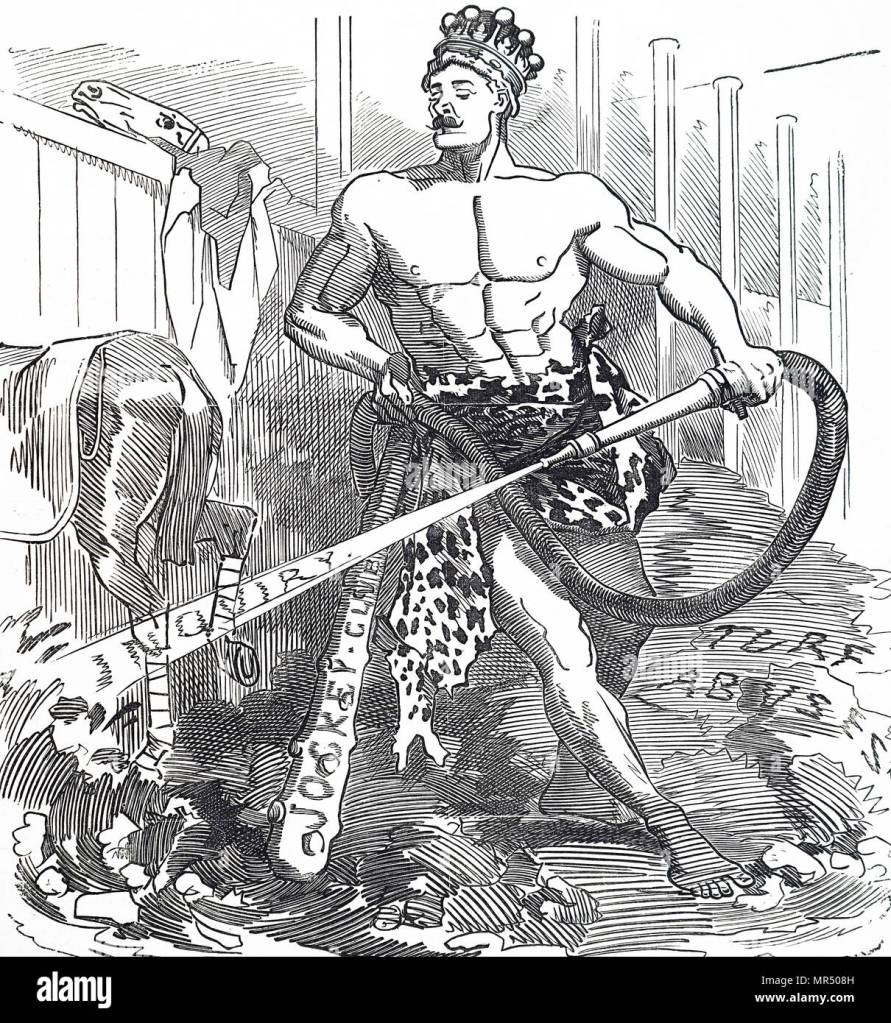 Hjälten blev känd för tolv stordåd. Till exempel dödade han hydran vid Lerna, som fick två nya huvuden när man högg av ett, och hämtade upp hunden Kerberos från underjorden. Hans mest storslagna bedrift – tyckte jag när jag i skolan fick göra hans bekantskap – var när han rensade kung Augias stall, som fått stå ostädat i trettio år, genom att leda en flod därigenom. Historien har rent trumpska proportioner, ty jobbet blev gjort på en dag.
