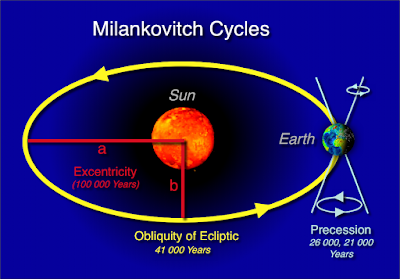 Själv tillhör jag den grupp medborgare som glaciologen och journalisten oroar sig över, nämligen alla vi som tar den uppmätta glaciärkrympningen med jämnmod ungefär lika oberört som vi mottar information om att haven höjer sig tre millimeter om året. Än sen då?, utropar vi, klimatet ändrar sig ju hela tiden, till och med SMHI, som ingen skulle anklaga för klimatförnekeri, säger att istider omväxlat med kortare värmeperioder under de senaste årsmiljonerna. Detta sägs bero på Milankovich-cyklerna som uttömmande förklaras i bilden.