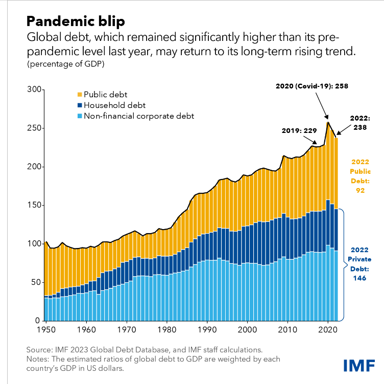 Till denna ena del av datan från IMF måste vi tillägga, inte för att vi vill storkna utan för att försöka greppa denna smått abstrakta pengabild, den andra delen som handlar om ländernas offentliga skulder på 91 000 miljarder dollar under 2022. Två år tidigare nådde dessa skulder 99 000 miljarder dollar eller 100 procent av BNI.