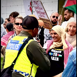 Jag har ställt frågan förr och tyvärr tvingas jag ständigt upprepa den: Kan vi lita på polisen? Jag blir mer och mer tveksam. Under snart två år har vi sett hur polisen låtit aggressiva, våldsamma Hamasanhängare ockupera det offentliga rummet på vanligt folks bekostnad och blivit mer och mer vänskaplig med de antidemokratiska krafterna. På fotot ovan, taget av författaren och journalisten Helene Bergman, ser vi hur polisen vänligt hälsar på den Sverigehatande och hotfulla islamisten Tara Saleh som tagit sig till ”demokrativeckan” i Almedalen.