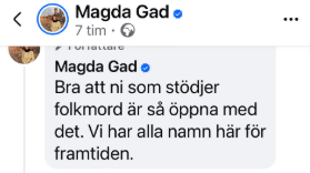 Magda Gad själv har för övrigt också sparat namnen på de personer som inte skrivit under henne lista och som därmed, enligt henne, ”stödjer folkmord”. En lista ”för framtiden”, förklarar hon beskäftigt på sociala medier.
