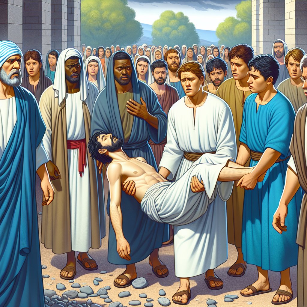 Då sade Petrus: ”Ananias, hur har Satan kunnat fylla ditt hjärta, så att du försöker lura den heliga anden och tar undan en del av pengarna du har fått för din jord? Var den inte din så länge du ägde den, och förfogade du inte över pengarna när den var såld? Hur kunde du komma på tanken att göra så? Det är inte människor du har försökt lura, utan Gud.” Vid de orden föll Ananias död ner, och alla som hörde på greps av stor fruktan.