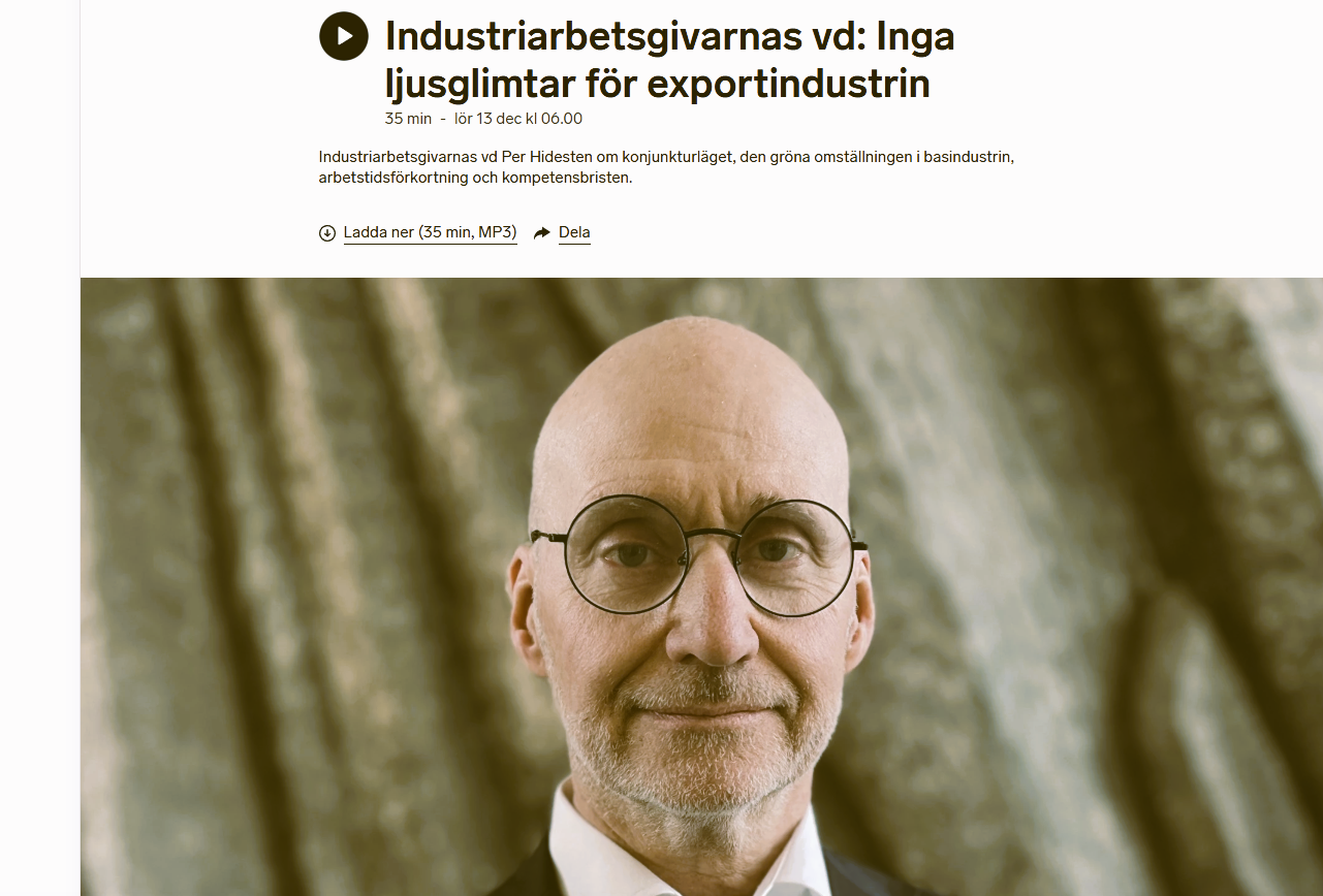 I radions Dagens Ekos lördagsintervju den 13 december intervjuades Per Hidesten, VD för industriarbetsgivarna. Denna organisation representerar svensk basindustri såsom stålindustrin, gruvindustrin, skogsindustrin och byggbranschen. Här finns många verksamheter som har stor betydelse för landets försörjning. Intressant nog så får vi veta att dessa företag exporterar nästan allt som de producerar. Varför har vi inte också företag som tar hand om deras produktion i landet?