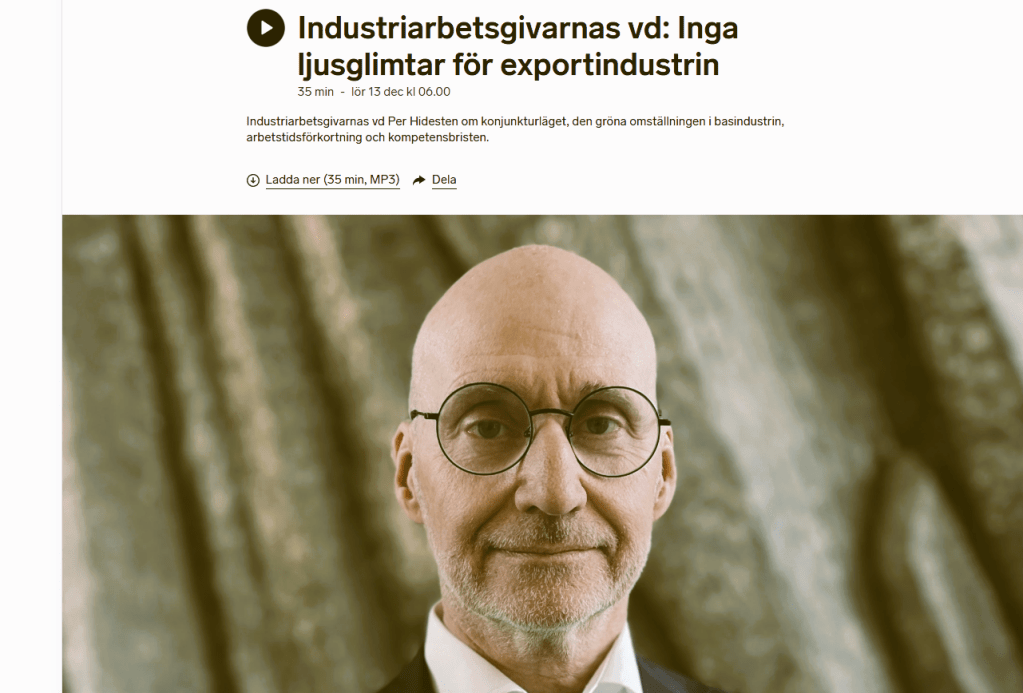 Det är en ytterst oroande bild om tillståndet i industrin som Hidesten ger. Rent generellt berättar han att konkurrensen är hård och företagen får kämpa för att klara sig. ”Det är pressat”, säger Hidesten. Men den beskrivningen är kanske varken särskilt skrämmande eller förvånande, så är det oftast i näringslivet. Dessutom är det naturligtvis den bilden han vill presentera för facken vid nästa löneförhandling. USAs tullar klagar han också på men det argumentet oskadliggjordes av journalisten med påpekandet att endast 5% av exporten går dit. Vad som däremot är verkligt oroande är att vi får veta att det viktigaste problemet är osäkerheten kring politiken. Våra företag är väldigt fokuserade på den gröna omställningen, säger Hidesten. Det finns signaler om att detta kan ändras.