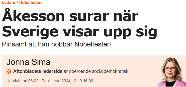 Det är pinsamt av Jimmie Åkesson att inte tacka ja till inbjudan till Nobelfesten, skriver Jonna Sima i Aftonbladet. Hon har naturligtvis fel, som hon nästan alltid har. Åkesson gjorde tvärtom helt rätt som inte föll för frestelsen att frottera sig med den egenmäktiga Nobelstiftelse som under så lång tid frusit ut honom samtidigt som de välkomnat representanter för förtryckardiktaturer.