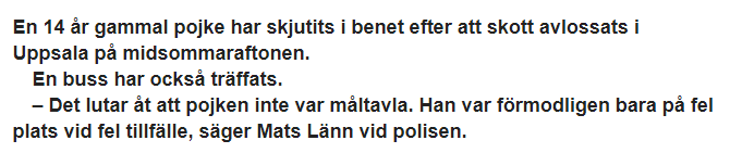 Den tonåring som blev skjuten i Uppsala på midsommarafton befann sig på fel plats vid fel tillfälle, enligt polisen. Platsen ifråga var en linjebuss i trafik.