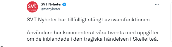 SVT Nyheter har stängt sitt kommentarsfält på Twitter, med anledning mordförsöket i Skellefteå eller, som de kallar det, ”den tragiska händelsen”. De får nu skarp kritik från Twitteranvändare som menar att den allmänhet som betalar för public service också borde få kommentera nyheterna. Men få är förvånade.