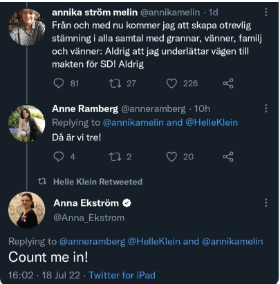 Journalisten Annika Ström Melin, med ett förflutet i bland annat public service och på DN, vill skapa otrevlig stämning i alla samtal fram till valet, eftersom hon tror det är en effektiv strategi mot Sverigedemokraterna. Det skriver hon på Twitter och före detta generalsekreteraren i advokatsamfundet, Anne Ramberg och utbildningsminister Anna Ekström är med på noterna.