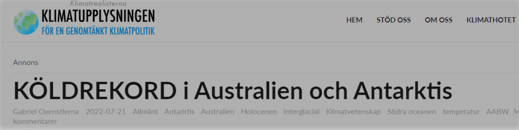 På sajten Klimatupplysningen (21/7 2021) skriver Gabriel Oxenstierna om att köldrekord har slagits i både Australien och Antarktis.