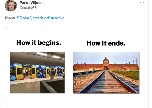 Efter att väktaren Pertti Viljanen lagt upp en bild på Twitter, där han drar paralleller mellan Sverigedemokraternas valreklam och Nazitysklands förintelseläger får han nu skarp kritik: ”Du borde skämmas!”