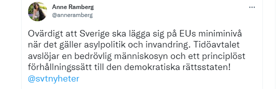 Anne Ramberg, tidigare generalsekreterare i Advokatsamfundet och känd för att ha krävt att andra ska göra avkall på sin välfärd, har uttryckt sin besvikelse över att Sverige lägger sig på EU:s miniminivå när det gäller invandring och asylpolitik. Nu får den privilegierade flyktingaktivisten skarp kritik på sociala medier.