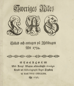 DENNA DAG I SVENSK HISTORIA 1734 års lag är den svenska lagrevision som är grunden för den nu gällande lagstiftningen i Sverige och Finland. Den är den senaste fullständiga lagrevisionen och ersatte de medeltida lagarna Kristofers landslag och stadslagen. Nu gällande lag i Sverige och Finland utgörs således av 1734 års lag med ändringar till dags dato.
