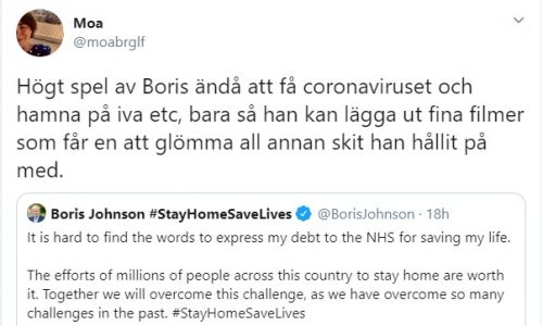 I ett uppmärksammat inlägg på Twitter raljerar Sydsvenskans ledarskribent Moa Berglöf över att Storbritanniens premiärminister Boris Johnson drabbats av coronaviruset.