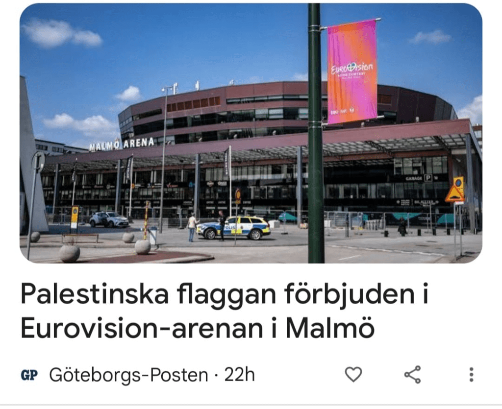 ”Palestinska flaggan förbjuden i Eurovision-arenan” är rubriken till en text i Göteborgsposten, som handlar om flaggreglerna Eurovision. Rubriken antyder att det är specifikt den palestinska flaggan som är förbjuden.