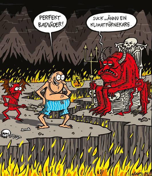 Skämtteckningen ovan visar en ”klimatförnekare” som hamnar i helvetet och stortrivs, allt medan djävulen frustrerat tittar på. Att förneka klimatet går naturligtvis inte, men att förneka huruvida vi står inför ett ”klimatnödläge” är realistiskt och så även alternativt att vara ”klimattvivlare”. I dagarna har FN:s klimatmöte, COP29, just avslutats i oljerika Baku där det (efter förlängning) slutligen beslutades att 300 miljarder USD årligen skall ”skickas” från den rika världen (alla OECD-länder där Sverige ingår) till det globala syd (utan att specificeras hur de skall användas). Länderna i det globala syd hade dock krävt betydligt mer, hela 1 300 miljarder USD per år, och var besvikna – för att utrycka sig diplomatiskt.