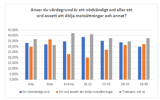 Den undersökning som nu redovisas, den åttonde i serien, återger väljarnas inställning till påståendet Anser du att ordet värdegrund är nödvändigt för att rätt styra våra liv eller anser du att det är ett luddigt ord, avsett att dölja motsättningar och andra svårigheter i livet? (I diagrammen är frågan förkortad).