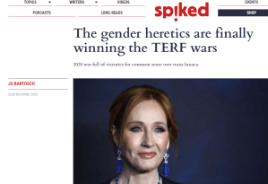 I en artikel på sajten Spiked (22/12 2020) nämner journalisten Jo Bartosch flera exempel från året som gått som visar att ”det sunda förnuftet” håller på att segra över ”transdårskapen” (trans lunacy) i det så kallade ”TERF-kriget” (TERF är en engelsk akronym som står för ”trans-exclusionary radical feminist”).